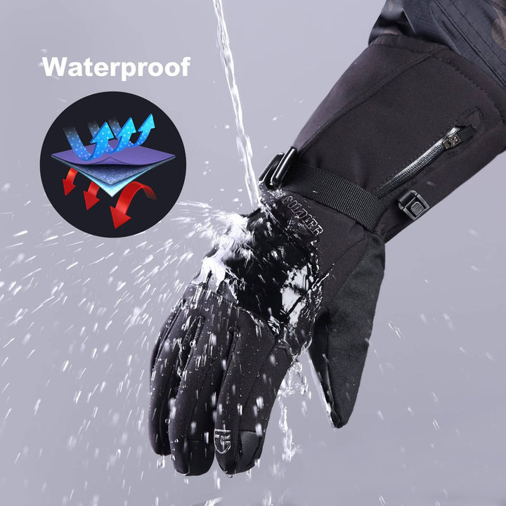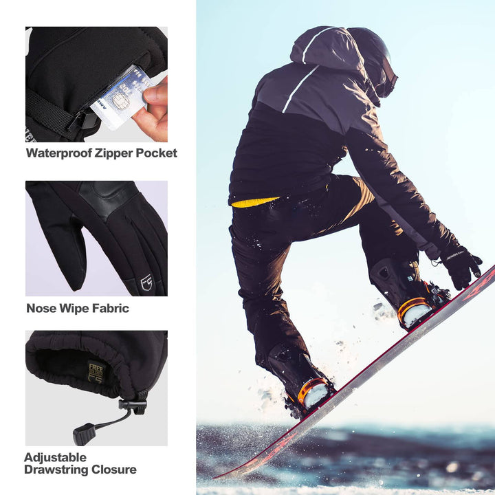Experience the ultimate winter comfort with our advanced women's ski gloves. Engineered with 3M Thinsulate insulation, they offer exceptional warmth and moisture-wicking properties. Their triple-layered waterproof design, featuring a TPU membrane and durable water repellent fabric, ensures your hands stay dry and cozy. The gloves boast anti-slip PU leather palms for enhanced grip and durability, plus a convenient nose wipe cloth. Designed for a custom fit, they include an adjustable wrist strap, drawstring closure, and a handy zippered pocket. Plus, the touch screen-friendly fingers allow for easy smartphone use. Perfect for skiing, snowboarding, and other winter adventures.