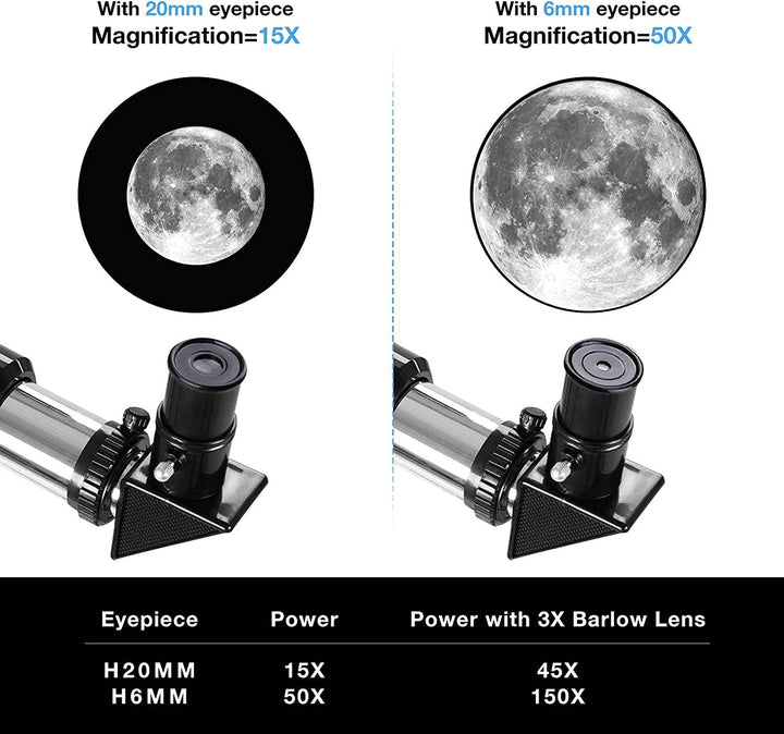 - ♥【High Magnification Fathers Day Gift】The telescope for adults is equipped with two replaceable eyepieces(10X, 25X) and one 3x barlow lens. 3x Barlow lens trebles the magnifying power of each eyepiece. The finder scope can be more accurate in position during stargazing. You can provide low-power and high-power celestial views at night, and you can see high-power celestial bodies during the day.
