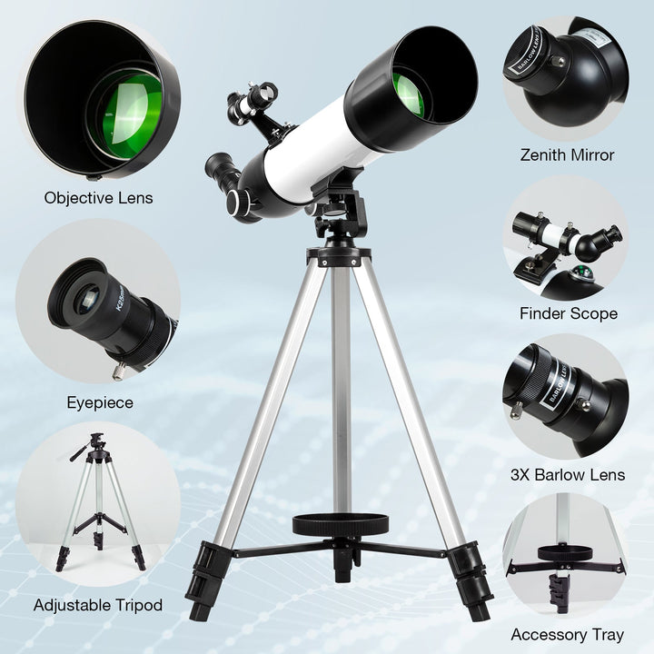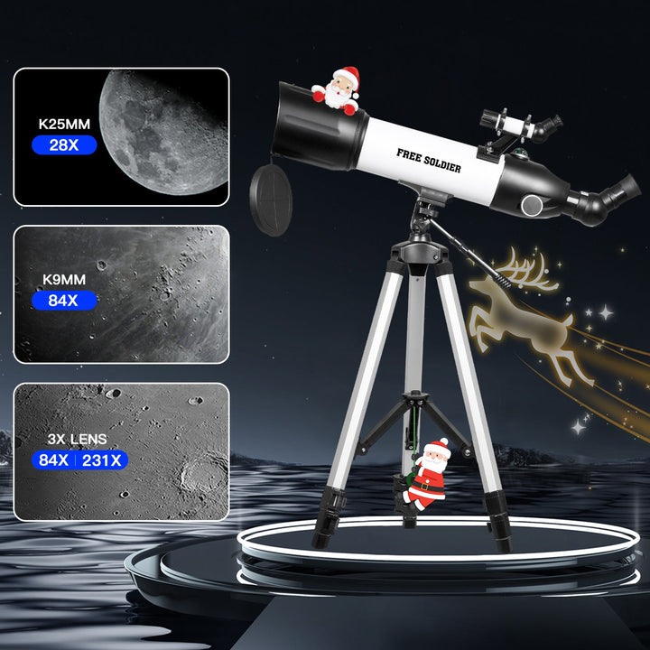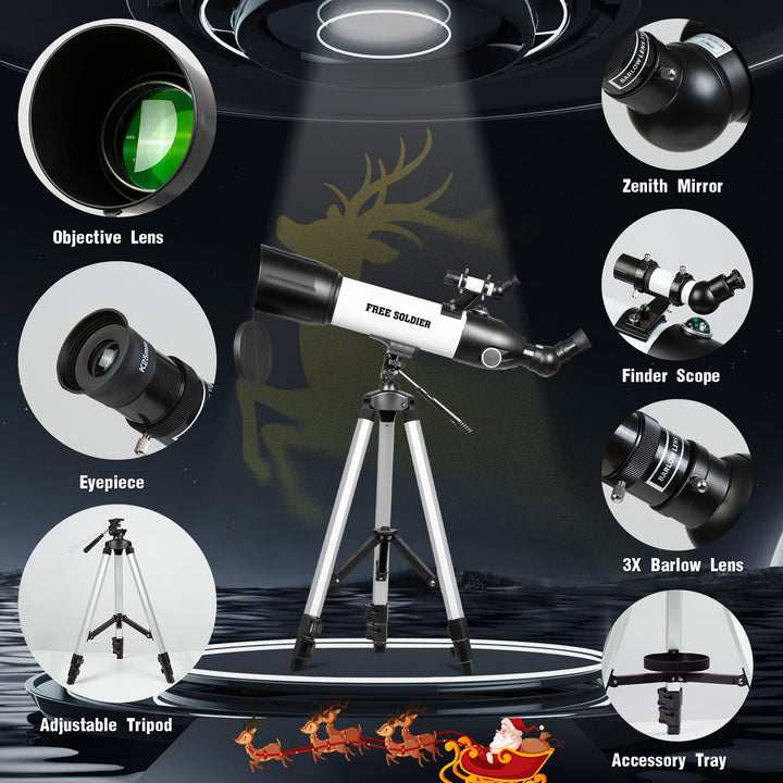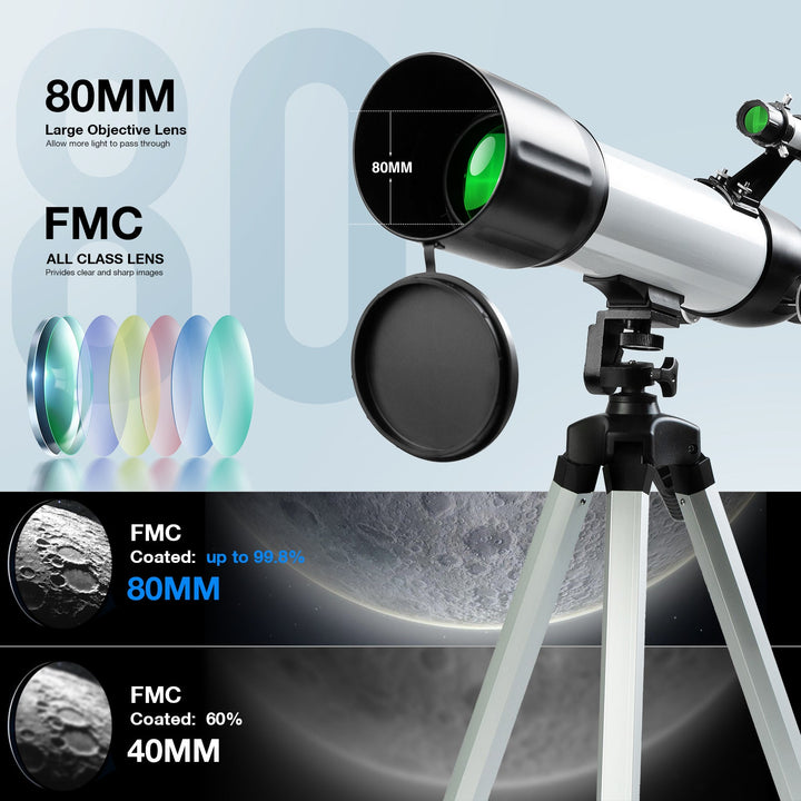 - ★【Astronomy Gift with Superior Optics】The refractor telescope features 500mm focal length and 80mm aperture, The viewing effect is better than 40070 in the market. 80mm objective lens collects more light than 60mm, 70mm telescope, so the image appears brighter in the eyepiece. A cool tech gift to your loved one on Christmas, Birthdays, Mother's Day, Thanksgiving Day, Valentine’s Day, anniversary, or as a thoughtful thank you present!