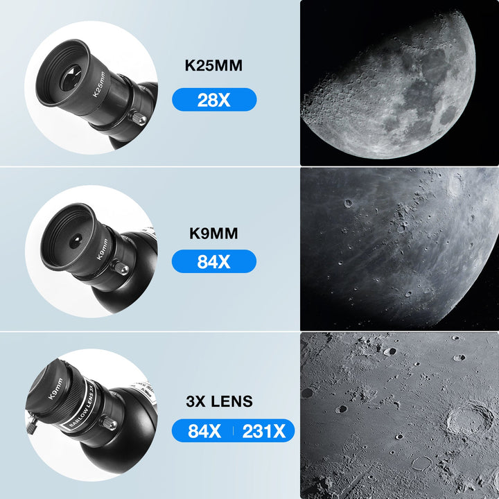 - ★【20X-166X Powerful Father's Day Gift】 This refractor telescope is equipped with a long focal length of 500mm. Comes with K9mm and K25mm eyepieces (Better than H series eyepiece), a 3x Barlow lens, and it can achieve a magnification of an astonishing 20 to 166 times. The 5x20 finder scope makes locating objects easy and precise.A perfect Father's Day gift unique birthday gift for him, your dad, papa, grandpa, father in low, or stepfather.