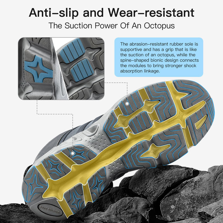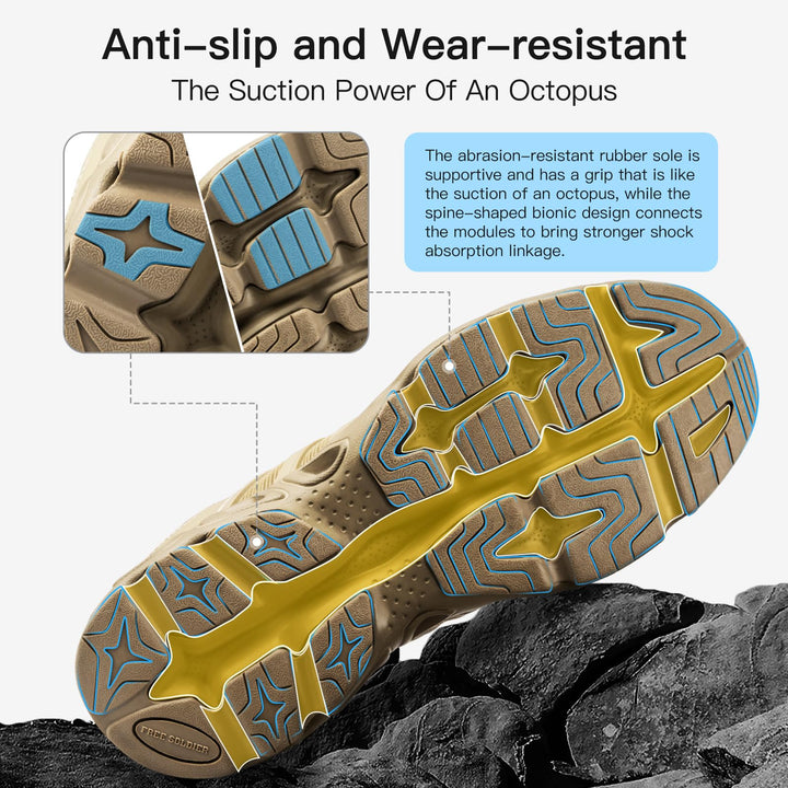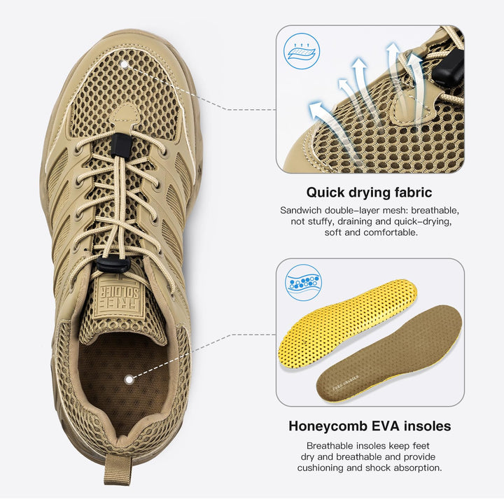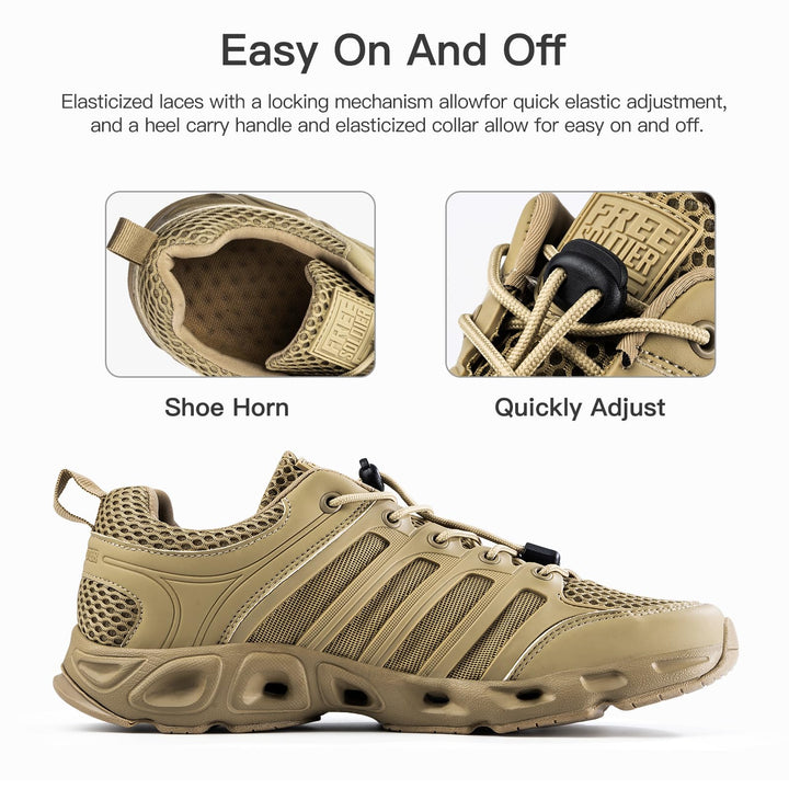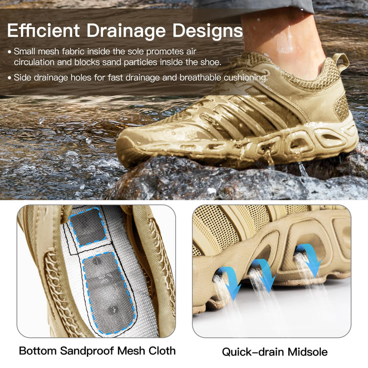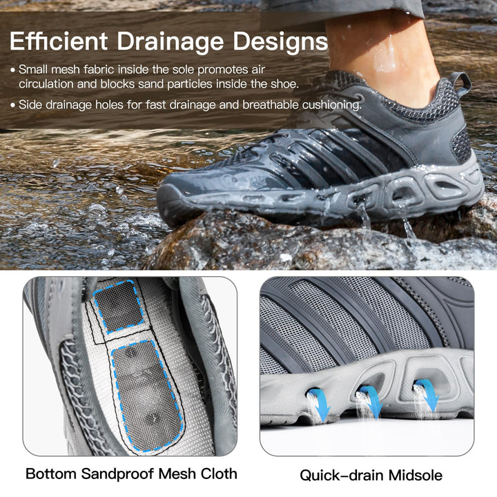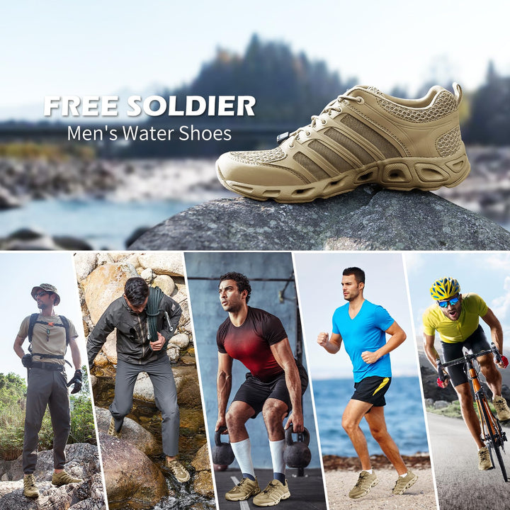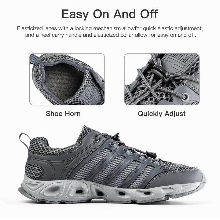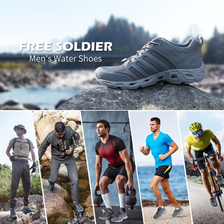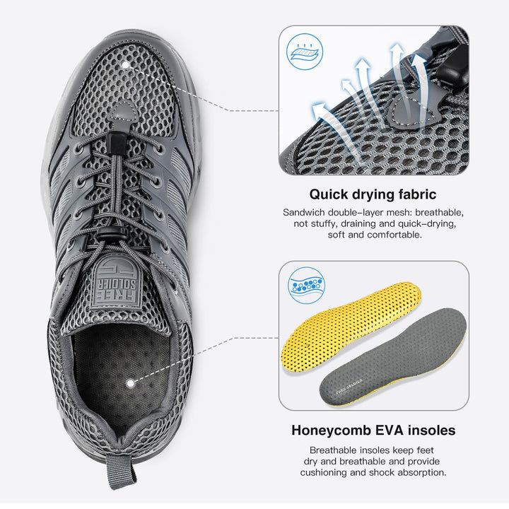 Experience the ultimate in comfort and performance with FREE SOLDIER men’s water shoes, designed for quick drying and high breathability. These shoes feature a knit mesh upper that drains water rapidly, a cushioned outsole with drainage holes, and a special foam material for excellent shock absorption. Lightweight and equipped with an anti-slip rubber outsole, they offer reliable traction and are easy to put on and take off with adjustable elastic shoelaces, making them ideal for a wide range of water and outdoor activities.